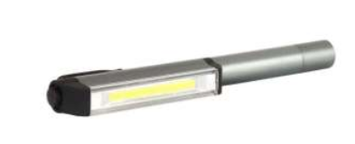 Compact flashlight in the shape of a pen. The flashlight is made entirely of durable Aluminum. Equipped with a durable COB LED generating a luminous flux of 180lm. It has a hanging clip and a built-in magnet. 3xAAA power supply (not included).