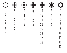 TORX: T10/ T15/ T20/ T20/ T25/ T25/ T27/ T30