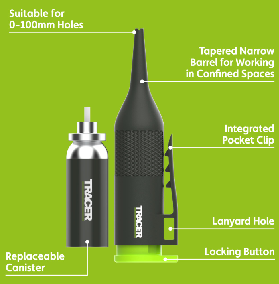 The TRACER Trueshot Chalk Marker Kit is a next-gen deep-hole marking tool, designed for pinpoint chalk marking from 0mm to 100mm in depth. With its simple point-and-spray action, the Trueshot Chalk Marker delivers a highly accurate cross mark when held directly to any surface. The high-visibility green chalk canister ensures a crisp, splatter-free chalk mark that’s clearly visible on light, dark, or uneven surfaces.